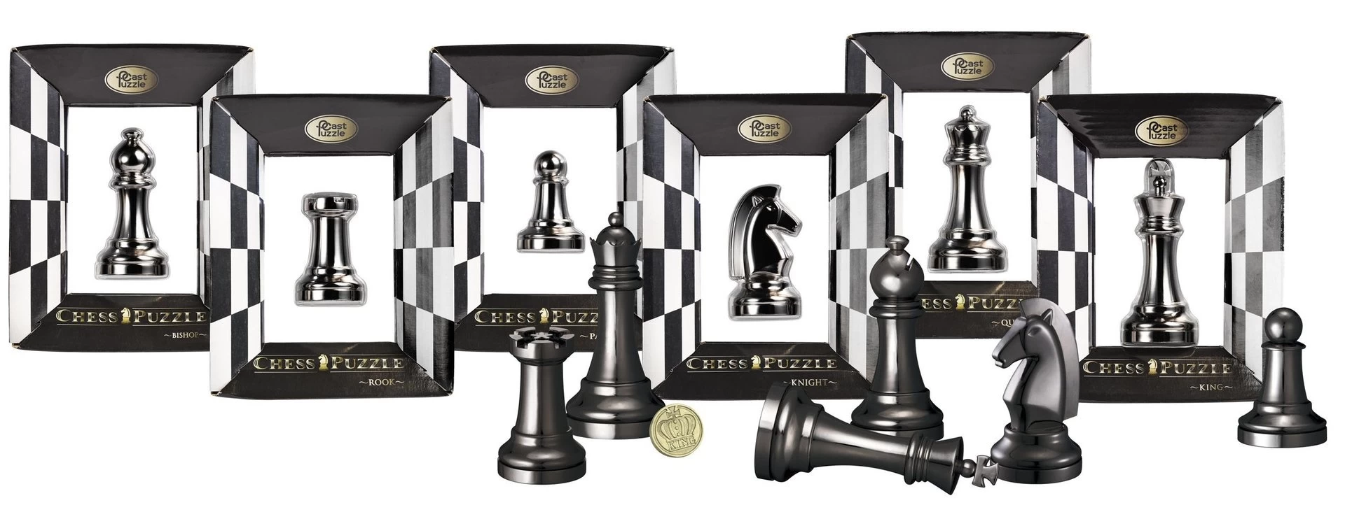 Deze unieke reeks bestaande uit 6 schaakstukken van Cast puzzels hebben allemaal dezelfde uitdaging: