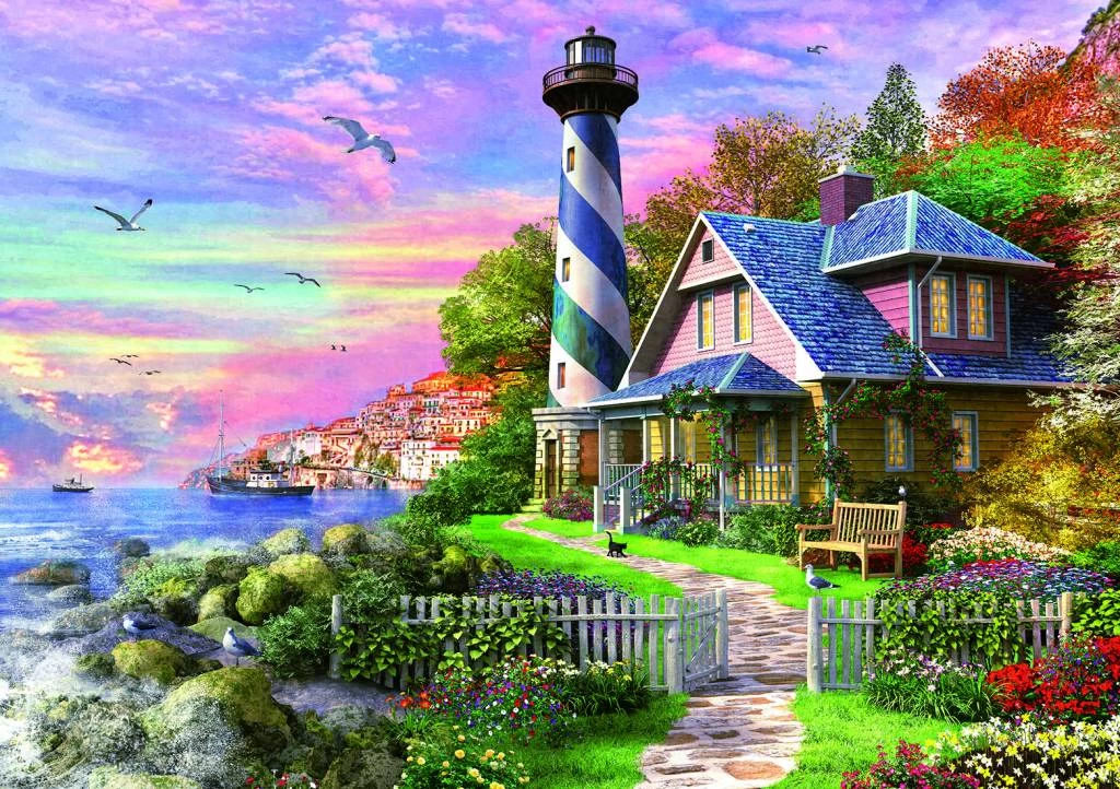 Puzzel van 1000 stukjes van een wit/blauwe vuurtoren naast de cottage. Deze puzzel bestaat ook in 4000 stukjes.